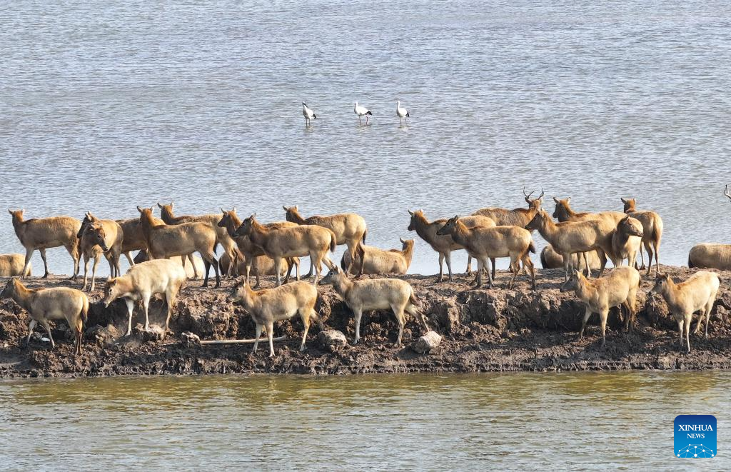 An aerial drone photo taken on Dec. 21, 2024 shows elks and oriental white storks on the Yellow Sea mudflats in Dafeng District of Yancheng City, east China's Jiangsu Province. The population of elks here has maintained a stable growth over years as the ecological environment in Dafeng District continues to improve. (Xinhua/Ji Chunpeng)