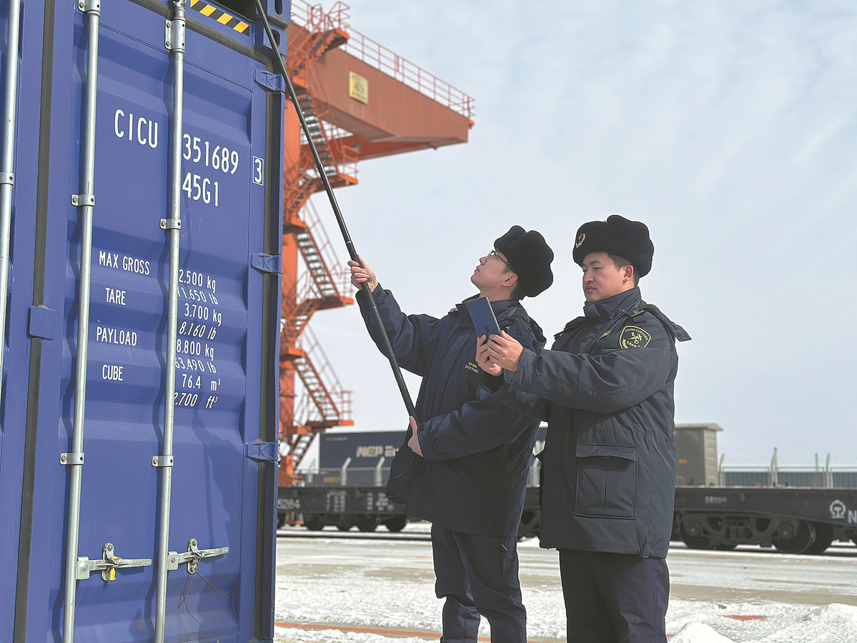 Two officers from Shenyang Customs use digital tools to inspect a container bound for export at the Shenyang assembly center of the China-Europe freight train service in Liaoning province in early December. (Photo/China Daily)