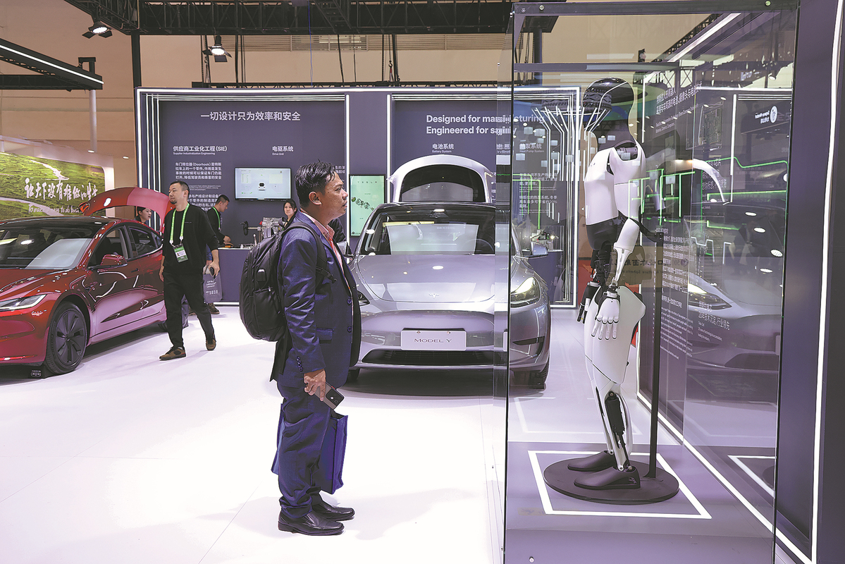 A visitor checks out a Tesla robot during the 2nd China International Supply Chain Expo in Beijing on Nov 26. (Wang Jing/China Daily)