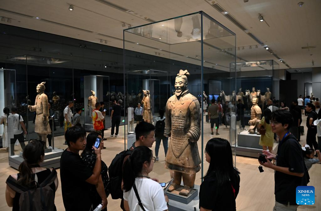 Tourists look at Terracotta Warriors at the Emperor Qinshihuang's Mausoleum Site Museum in Xi'an, northwest China's Shaanxi Province, Sept. 8, 2024. Xi'an, also known as Chang'an in ancient times, has a history stretching back over 3,100 years. Boasting world-famous sites such as the Terracotta Warriors, Xi'an served as the capital for 13 dynasties over the course of China's history. Today, tradition and modernity are intertwined in Xi'an, and its history is embedded within the hustle and bustle of urban life. (Xinhua/Li Yibo)
