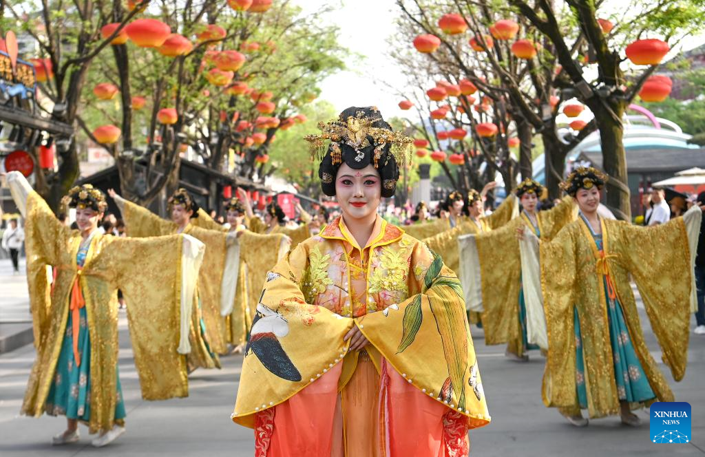 Dancers donning traditional Hanfu attire perform during a parade at the Grand Tang Mall, a Tang Dynasty-themed pedestrian area, in Xi'an, northwest China's Shaanxi Province, April 11, 2024. Xi'an, also known as Chang'an in ancient times, has a history stretching back over 3,100 years. Boasting world-famous sites such as the Terracotta Warriors, Xi'an served as the capital for 13 dynasties over the course of China's history. Today, tradition and modernity are intertwined in Xi'an, and its history is embedded within the hustle and bustle of urban life. (Xinhua/Zou Jingyi)