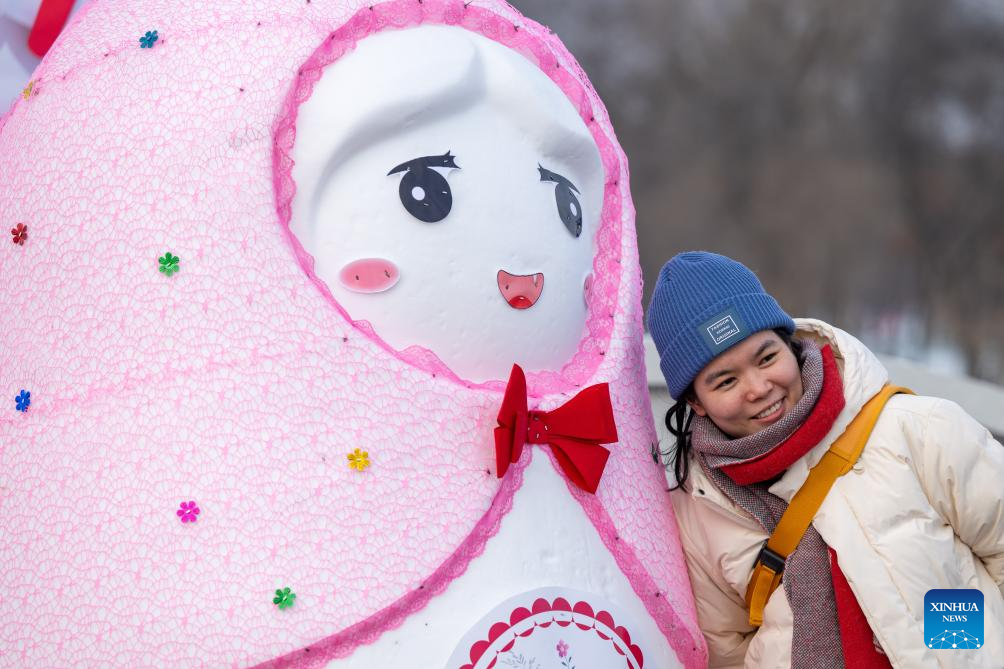 A tourist poses for a photo with a snow sculpture at the 37th Sun Island International Snow Sculpture Expo in Harbin, northeast China's Heilongjiang Province, Dec. 23, 2024. The 37th Sun Island International Snow Sculpture Expo began its trial operation here Monday. (Xinhua/Zhang Tao)