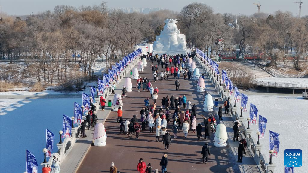 In this aerial drone photo, tourists visit the 37th Sun Island International Snow Sculpture Expo in Harbin, northeast China's Heilongjiang Province, Dec. 23, 2024. The 37th Sun Island International Snow Sculpture Expo began its trial operation here Monday. (Xinhua/Wang Song)