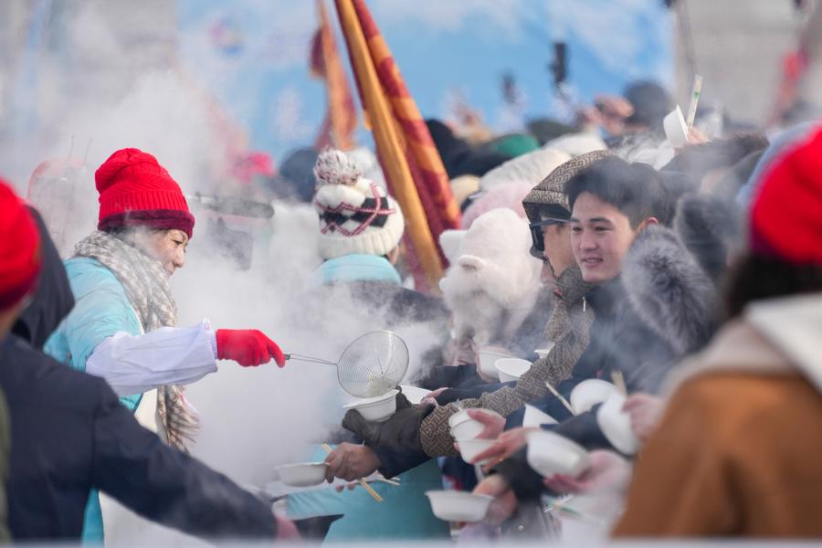Tourists taste dumplings fresh from the pot during an ice collecting festival in Harbin, northeast China's Heilongjiang Province, Dec. 7, 2024. (Xinhua/Wang Jianwei)