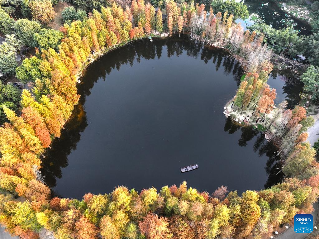 An aerial drone photo taken on Dec. 24, 2024 shows a view of Nanhu Park in Nanning, south China's Guangxi Zhuang Autonomous Region. (Photo by Yu Xiangquan/Xinhua)