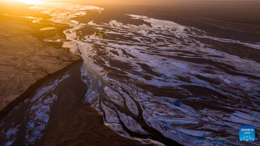 An aerial drone photo taken on Dec. 24, 2024 shows a view of the Da Haltent River in Kazak Autonomous County of Aksay, northwest China's Gansu Province. (Photo by Gao Hongshan/Xinhua)