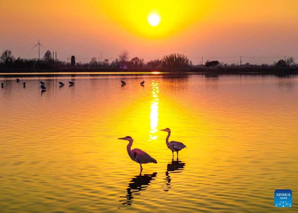 A drone photo taken on Dec. 25, 2024 shows migrant birds at the Lixiahe National Wetland Park in Xinghua City, east China's Jiangsu Province. (Photo by Zhou Shegen/Xinhua)
