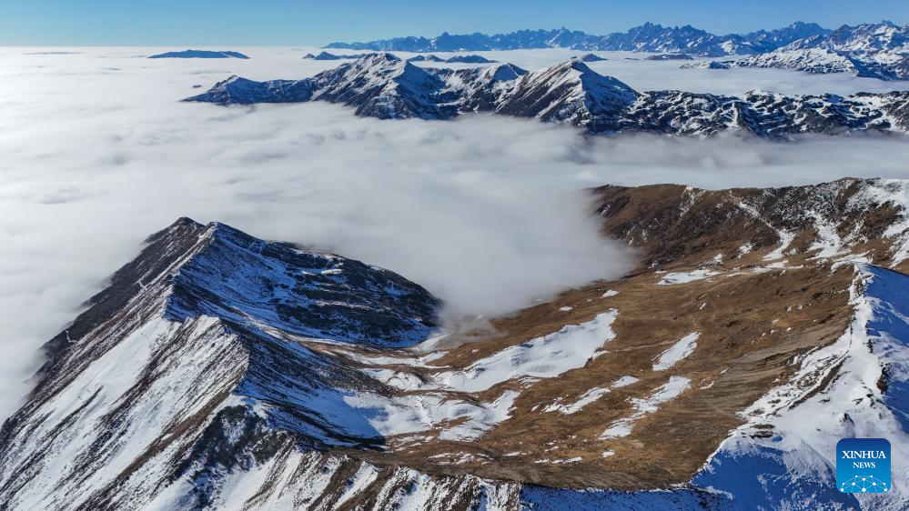 An aerial panoramic photo taken on Dec. 25, 2024 shows the cloud-shrouded Jiajin Mountain in Xiaojin County, Aba Tibetan and Qiang Autonomous Prefecture, southwest China's Sichuan Province. (Xinhua/Wang Xi)