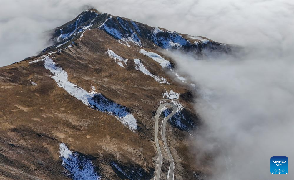An aerial drone photo taken on Dec. 25, 2024 shows the cloud-shrouded Jiajin Mountain in Xiaojin County, Aba Tibetan and Qiang Autonomous Prefecture, southwest China's Sichuan Province. (Xinhua/Wang Xi)
