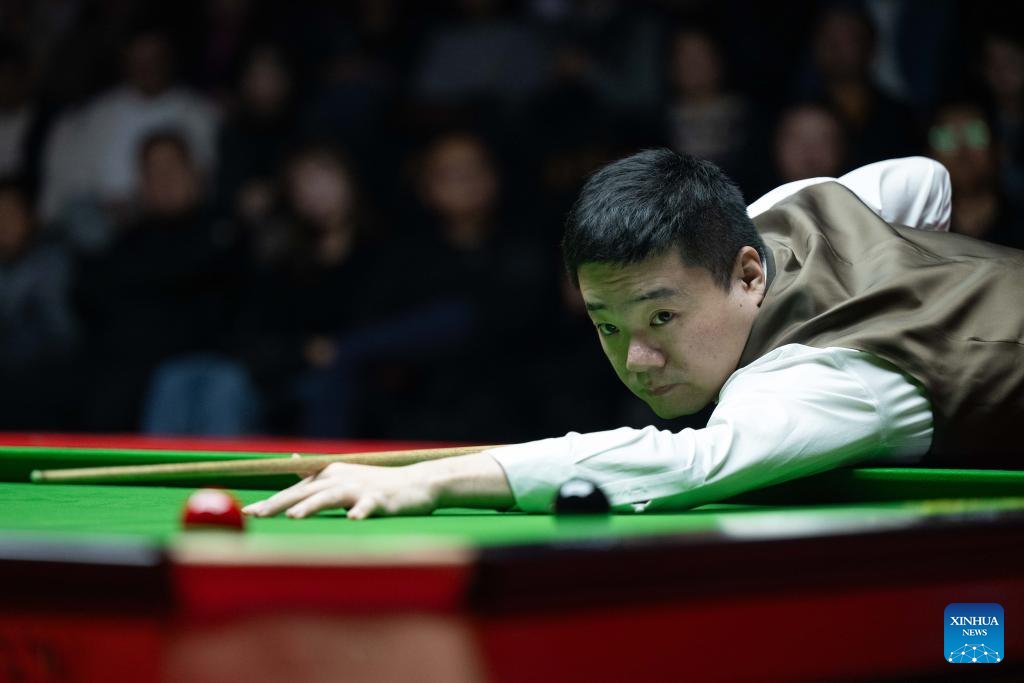 Ding Junhui of China plays a shot during the match against Judd Trump of England at 2024 Macao Snooker Masters in south China's Macao, Dec. 25, 2024. (Xinhua/Cheong Kam Ka)
