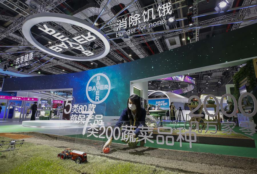 A staff member works at the booth of Bayer at the Medical Equipment and Healthcare Products exhibition area during the third China International Import Expo (CIIE) in Shanghai, east China, Nov. 7, 2020. (Xinhua/Zhang Yuwei)
