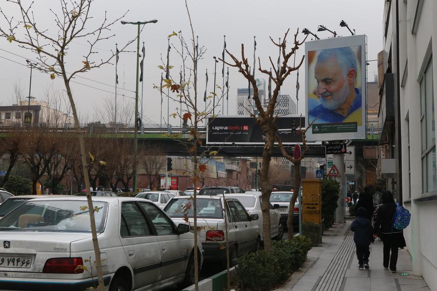 People walk past a billboard showing late Iranian General Qassem Soleimani in Tehran, Iran, on Jan. 2, 2022, one day ahead of the second anniversary of his assassination by the United States in Iraq. (Xinhua/Gao Wencheng)