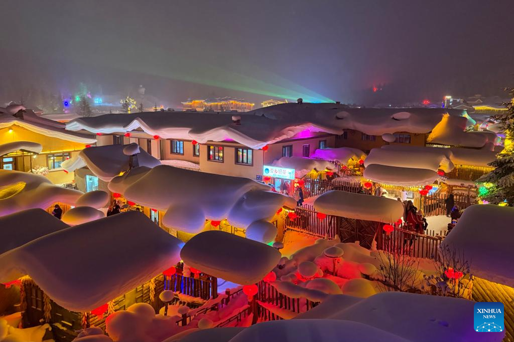This photo taken on Dec. 28, 2024 shows the night view of a snow town scenic area in Hailin City, northeast China's Heilongjiang Province. Located in Hailin City of Heilongjiang Province, the scenic area has seen a peak of tourism recently with the average number of daily visitors exceeding 20,000. (Xinhua/Yang Siqi)