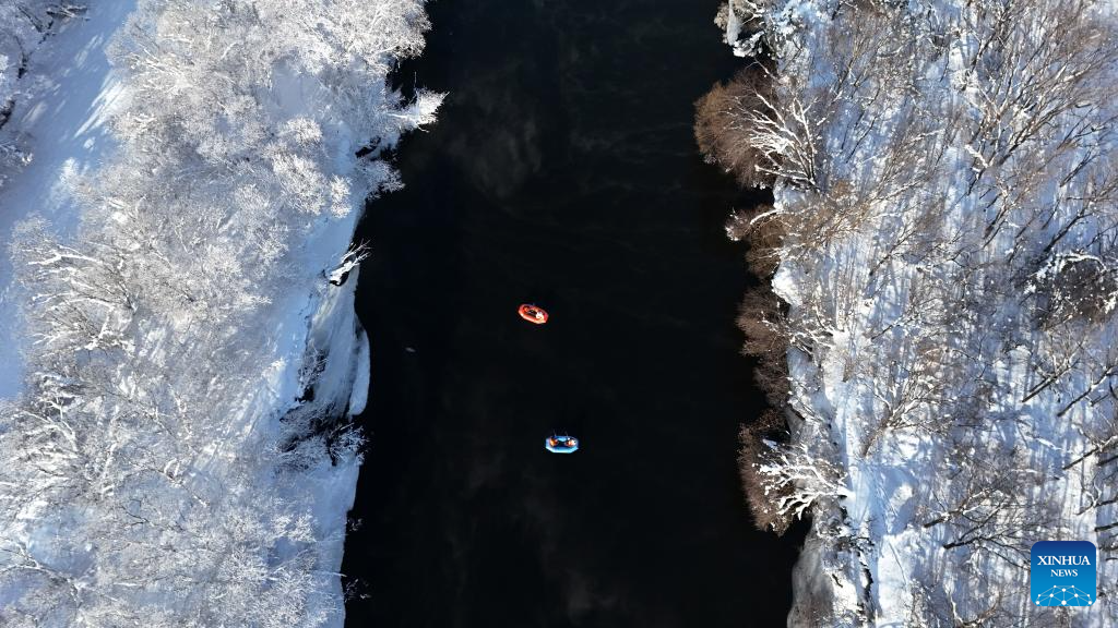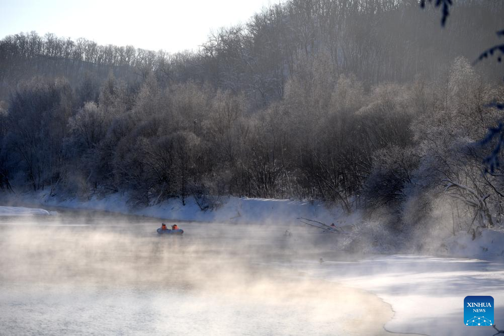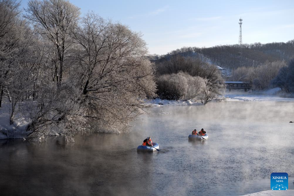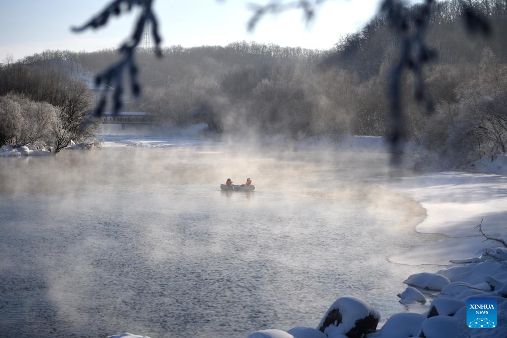 Tourists drift at a scenic spot in Wudalianchi City of northeast China's Heilongjiang Province, Dec. 30, 2024. (Xinhua/Ding He)