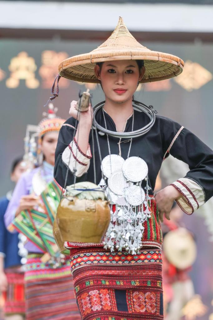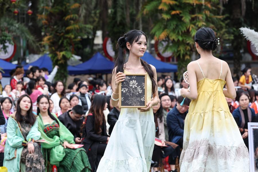 Actors display local cultural and creative products during an ethnic fashion show in Wuzhishan, south China's Hainan Province, Dec. 29, 2024. (Xinhua/Zhang Liyun)