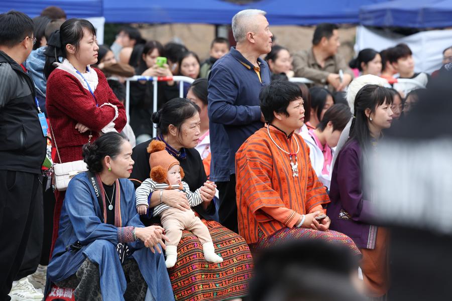 People watch an ethnic fashion show in Wuzhishan, south China's Hainan Province, Dec. 29, 2024.(Xinhua/Zhang Liyun)