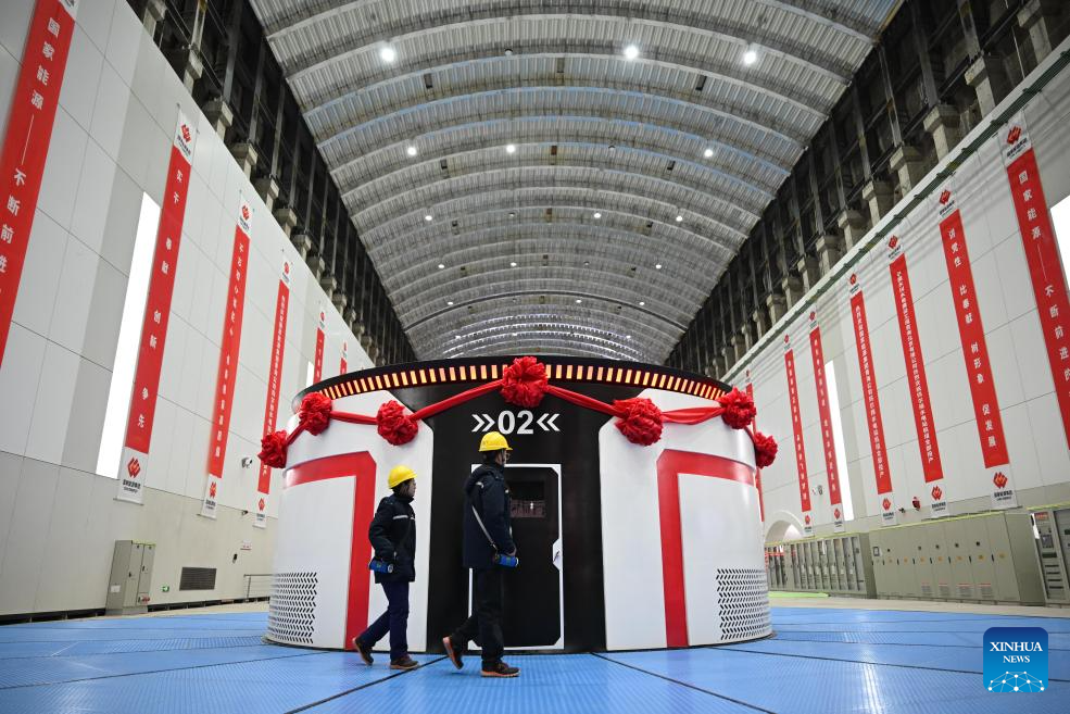 Staff members check the operational status of the Maerdang Hydropower Station in Hainan Tibetan Autonomous Prefecture in northwest China's Qinghai Province, Dec. 31, 2024.