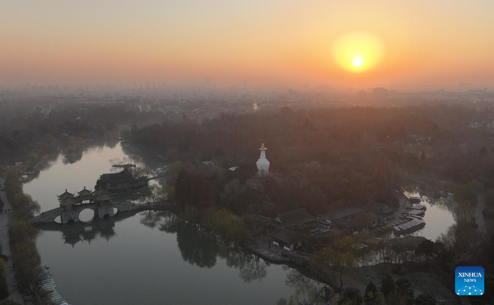 An aerial drone photo taken on Jan. 1, 2025 shows the sunrise scenery taken in the Slender West Lake scenic spot in Yangzhou, east China's Jiangsu Province. (Photo by Meng Delong/Xinhua)