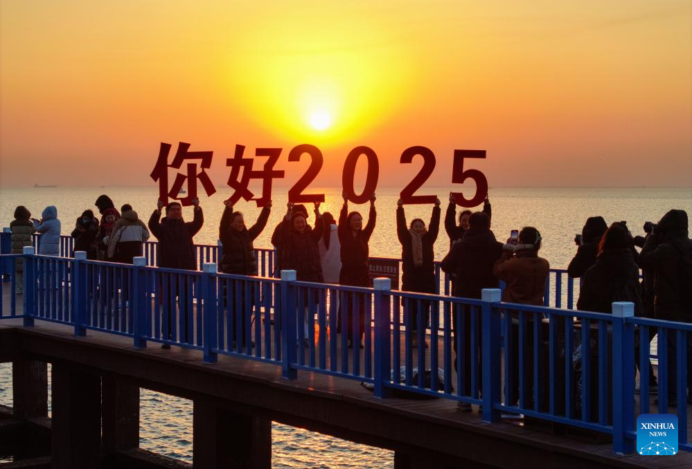 Tourists holding cards with their greetings meaning "Hello, 2025" pose for photos at sunrise in Lianyungang City, east China's Jiangsu Province, Jan. 1, 2025. (Photo by Wang Jianmin/Xinhua)
