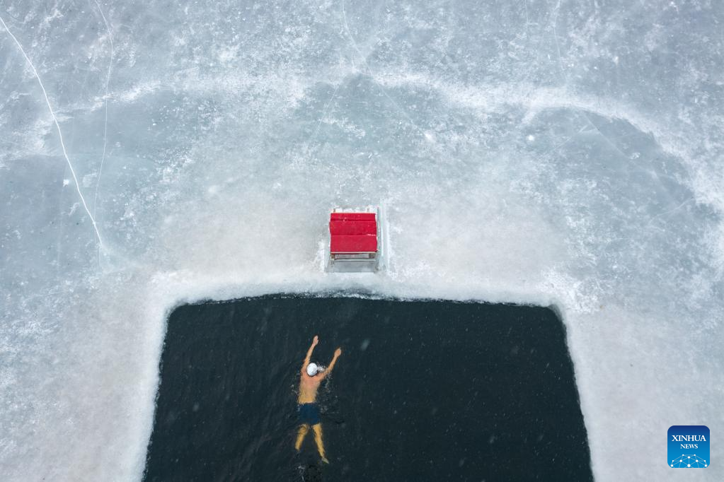 An aerial drone photo taken on Jan. 1, 2025 shows a winter swimming enthusiast swimming in Harbin, northeast China's Heilongjiang Province. People across China enjoy themselves in various activities, celebrating the first day of 2025. (Xinhua/Zhang Tao)