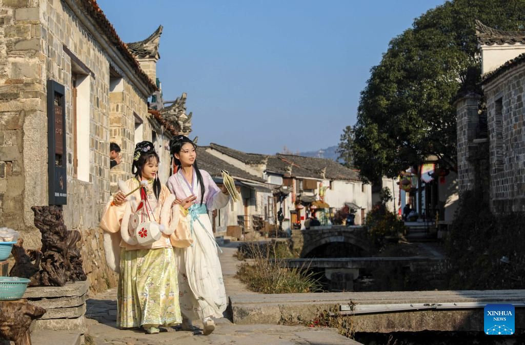 Tourists in traditional costumes visit Taohuatan Township, Jingxian County, east China's Anhui Province, Jan. 1, 2025. People across China enjoy themselves in various activities, celebrating the first day of 2025. (Xinhua/Cao Li)