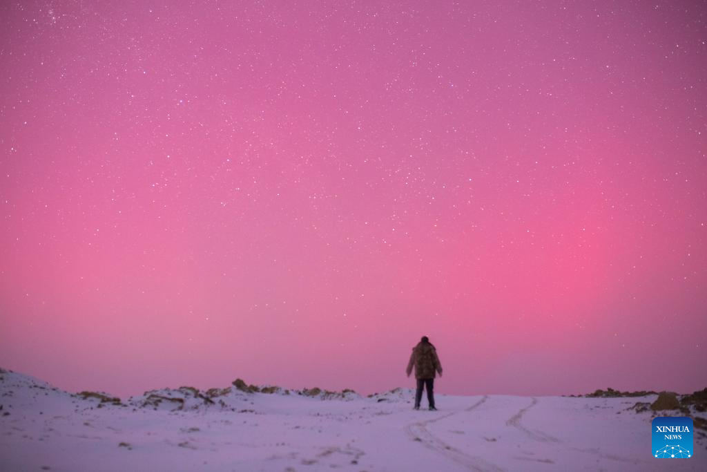 A photography enthusiast watches the aurora in Jiamusi City, northeast China's Heilongjiang Province, on Jan. 2, 2025. (Photo by Chen Zhiguo/Xinhua)