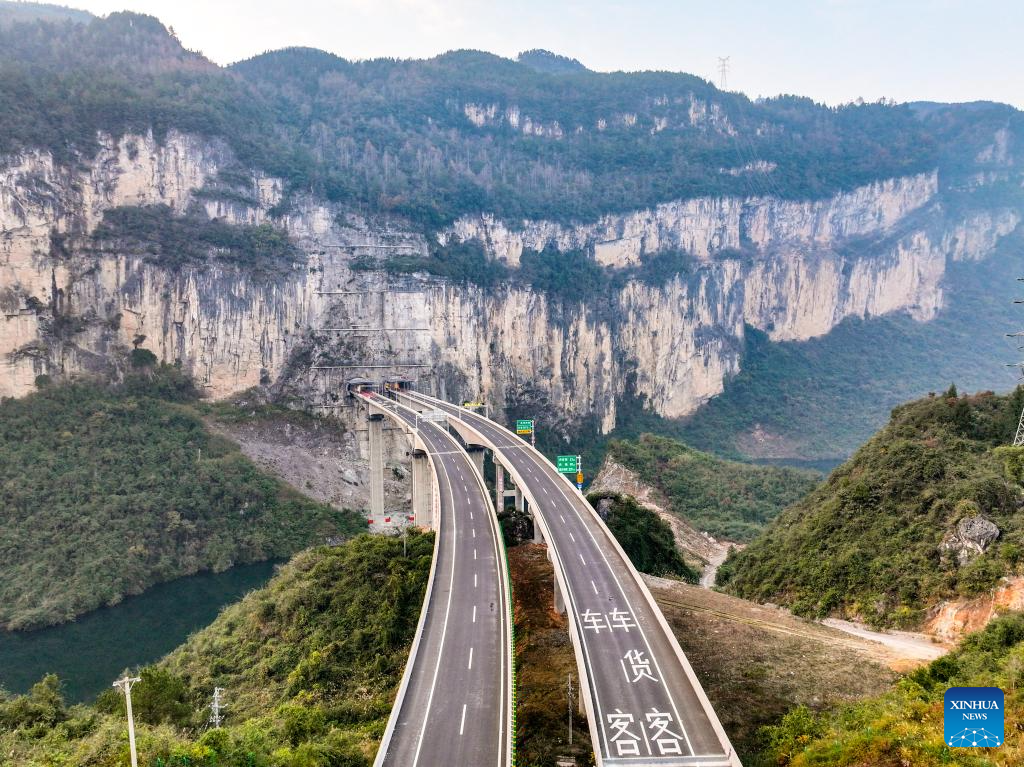This aerial drone photo taken on Jan. 1, 2025 shows a section of the second expressway connecting southwest China's Chongqing Municipality and central China's Hunan Province. The second Chongqing-Hunan expressway saw its 127-km Banan-Wulong section and 91.6-km Pengshui-Youyang section, both in Chongqing, opened to public traffic on Thursday. The whole expressway, with a length of 280 kilometers, is expected to put in full operation within 2025. (Xinhua/Tang Yi)
