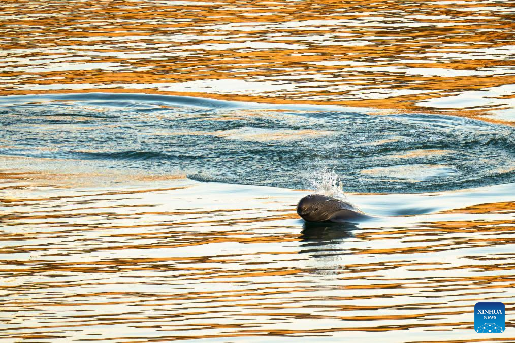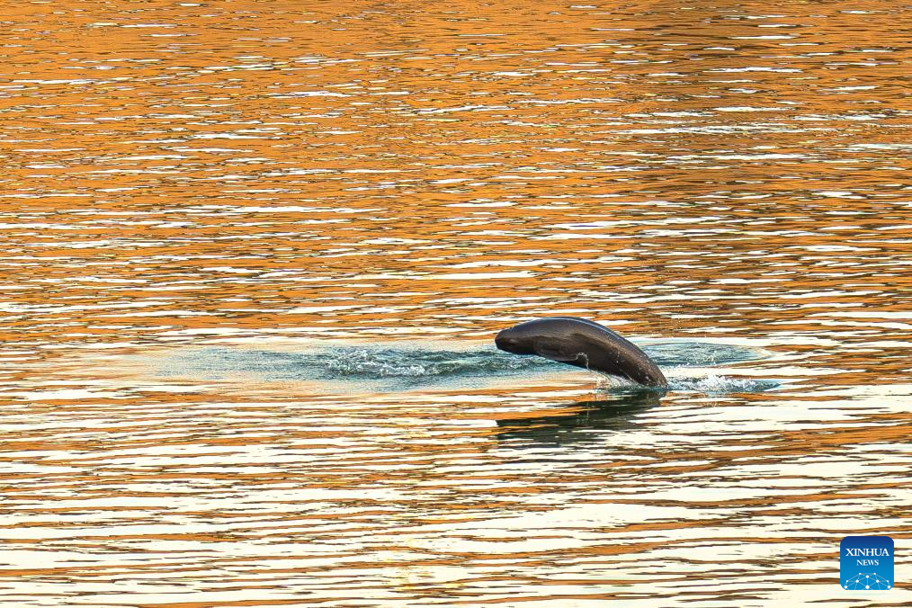 This photo taken on Jan. 5, 2025 shows a Yangtze finless porpoise swimming near the lower reaches of the Gezhouba Dam in Yichang City, central China's Hubei Province. The Yangtze finless porpoise is a national first-class protected wild animal and its population status serves as a "barometer" of the ecological environment of the Yangtze River. In recent years, the population of the species here has increased steadily as systematic ecological restoration efforts were implemented. (Xinhua/Xiao Yijiu)