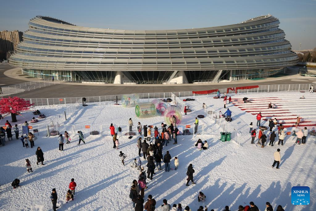People enjoy themselves at the National Speed Skating Oval in Beijing, capital of China, Jan. 4, 2025. People flocked to the National Speed Skating Oval to have fun with ice and snow during the weekend. (Xinhua/Zhang Chenlin)