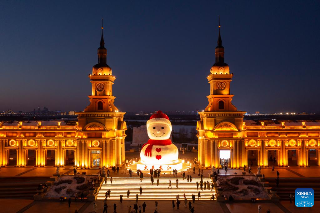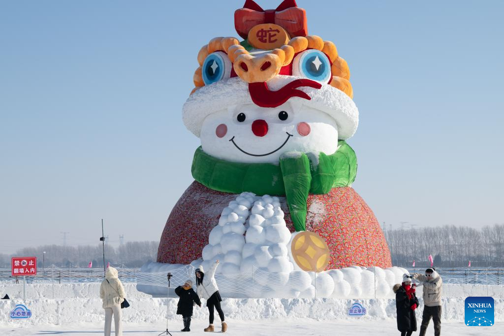 People pose for photos with snowmen "Dongdong" and "Beibei" in Harbin, capital of northeast China's Heilongjiang Province, Jan. 3, 2025. Harbin, with many snow sculptures across the city, has emerged as one of China's top winter travel destinations, attracting tourists from around the globe. (Xinhua/Xie Jianfei)