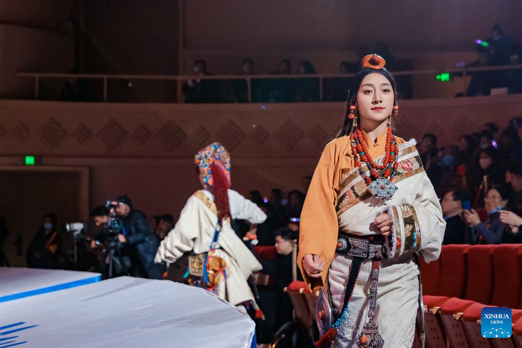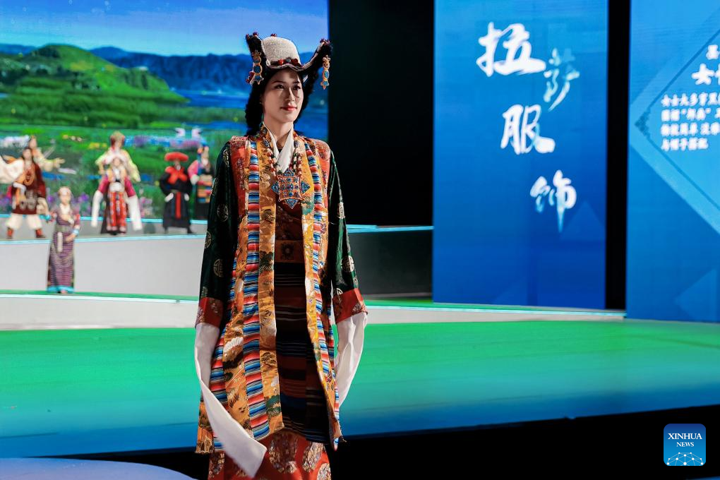 This photo taken on Jan. 3, 2025 shows a costume show during the opening ceremony of a clothing culture week in Lhasa, southwest China's Xizang Autonomous Region. The clothing culture week, first of its kind in Xizang Autonomous Region, kicked off here on Friday, with the aim of presenting the charm of Tibetan clothing culture and promoting the development of local cultural tourism industry. (Xinhua)