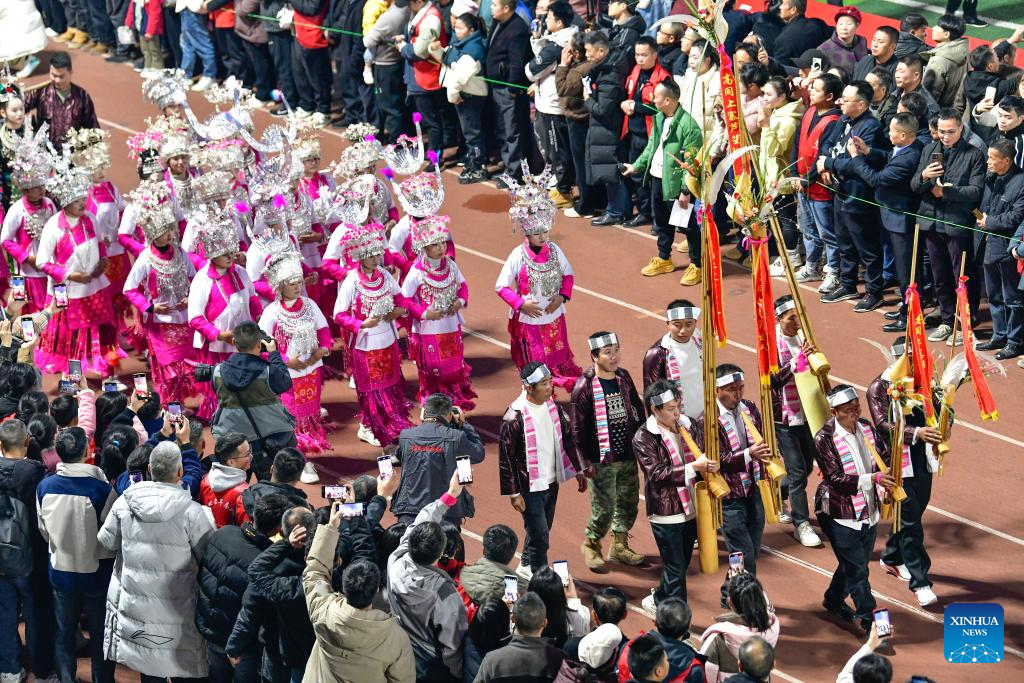 Cheering squads parade during the opening ceremony of the Village Super League 2025 in Rongjiang County of southwest China's Guizhou Province, Jan. 4, 2025. The Village Super League, an amateur football tournament dubbed "Cun Chao" by Chinese netizens, started its third season on Saturday. More than 3,000 players of 108 teams participate in the games this year. (Xinhua/Yang Wenbin)