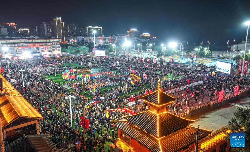 An aerial drone photo taken on Jan. 4, 2025 shows the opening ceremony of the Village Super League 2025 in Rongjiang County of southwest China's Guizhou Province. The Village Super League, an amateur football tournament dubbed "Cun Chao" by Chinese netizens, started its third season on Saturday. More than 3,000 players of 108 teams participate in the games this year. (Xinhua/Yang Wenbin)