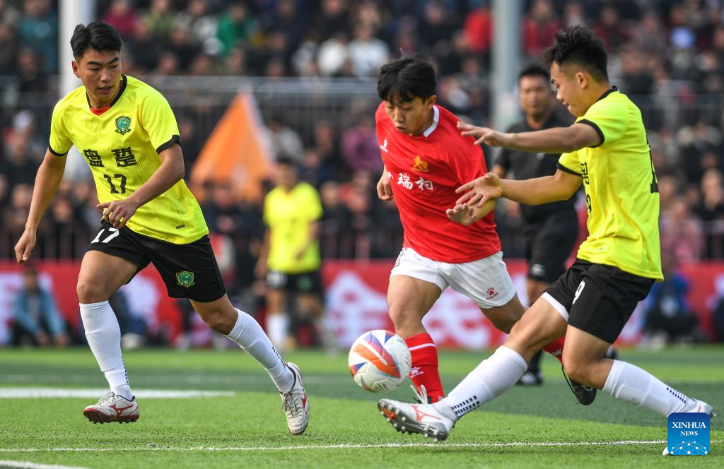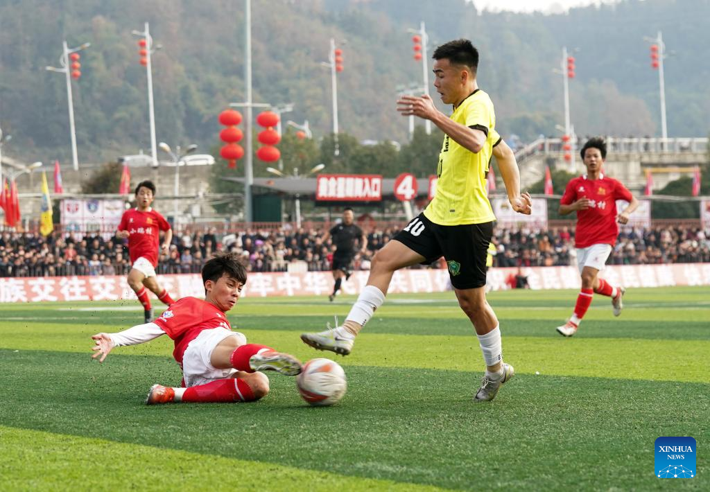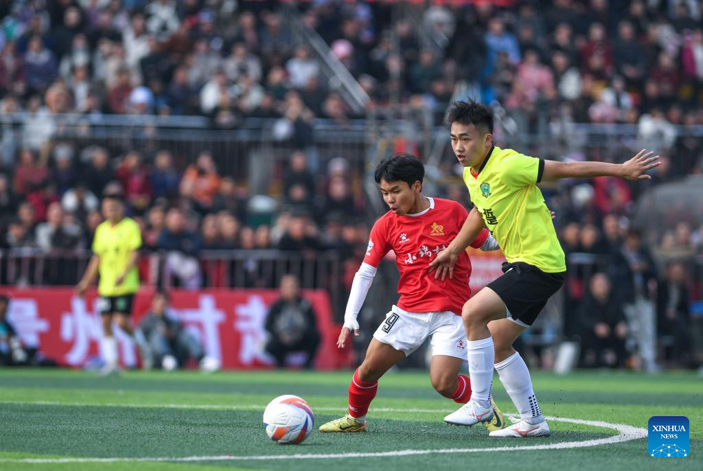 Players of Xiaorui Village and Panxue Village compete during the opening game at the Village Super League 2025 in Rongjiang County of southwest China's Guizhou Province, Jan. 4, 2025. The Village Super League, an amateur football tournament dubbed "Cun Chao" by Chinese netizens, started its third season on Saturday. More than 3,000 players of 108 teams participate in the games this year. (Xinhua/Wang Bingzhen)