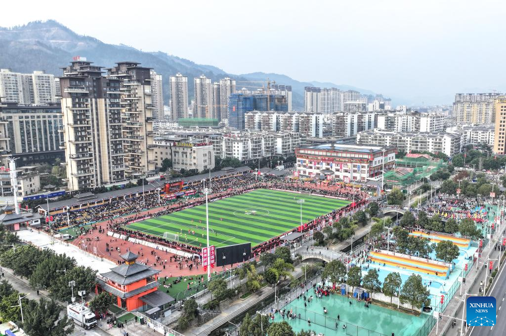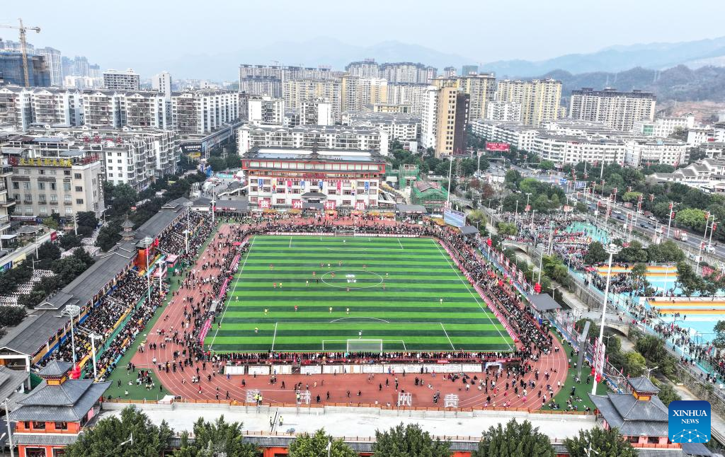 An aerial drone photo taken on Jan. 4, 2025 shows the opening game at the Village Super League 2025 in Rongjiang County of southwest China's Guizhou Province. The Village Super League, an amateur football tournament dubbed "Cun Chao" by Chinese netizens, started its third season on Saturday. More than 3,000 players of 108 teams participate in the games this year. (Xinhua/Yang Wenbin)
