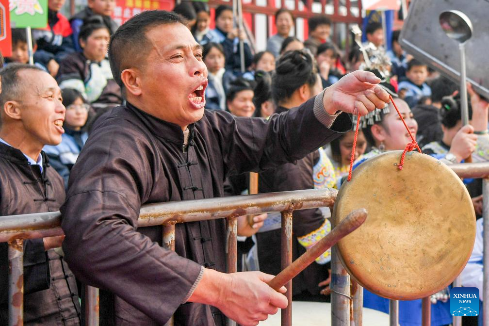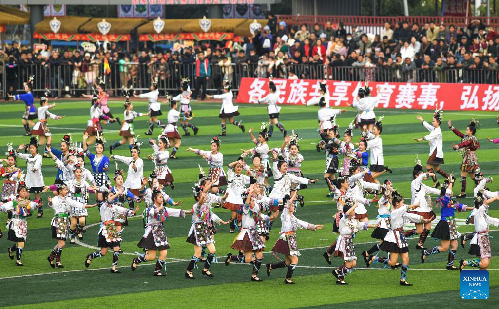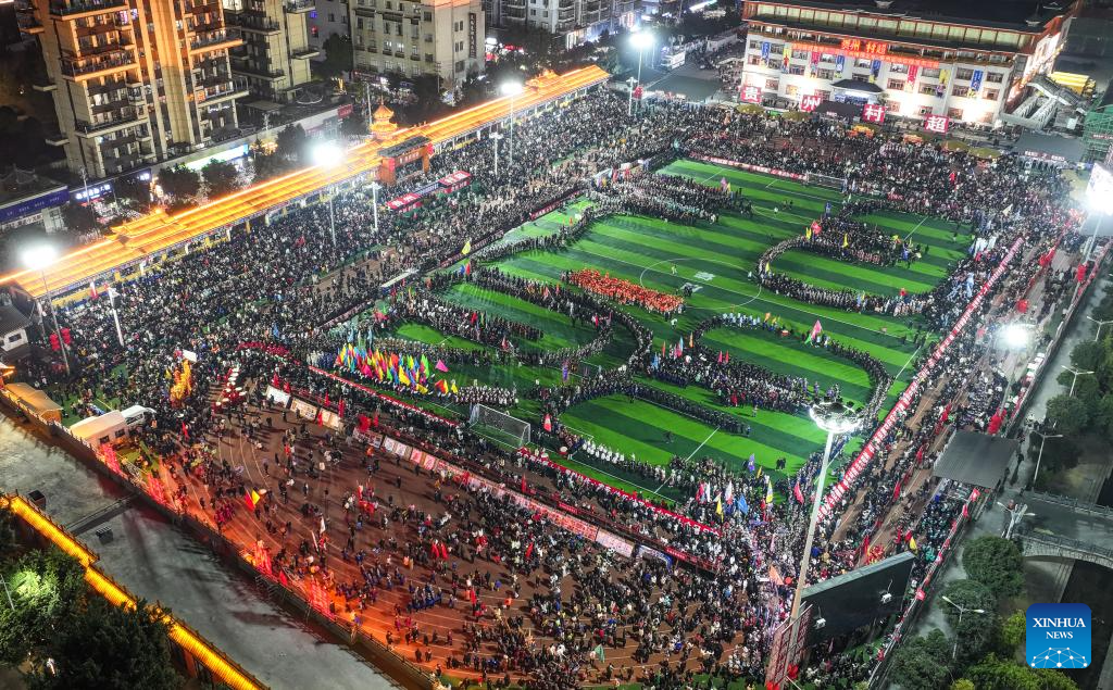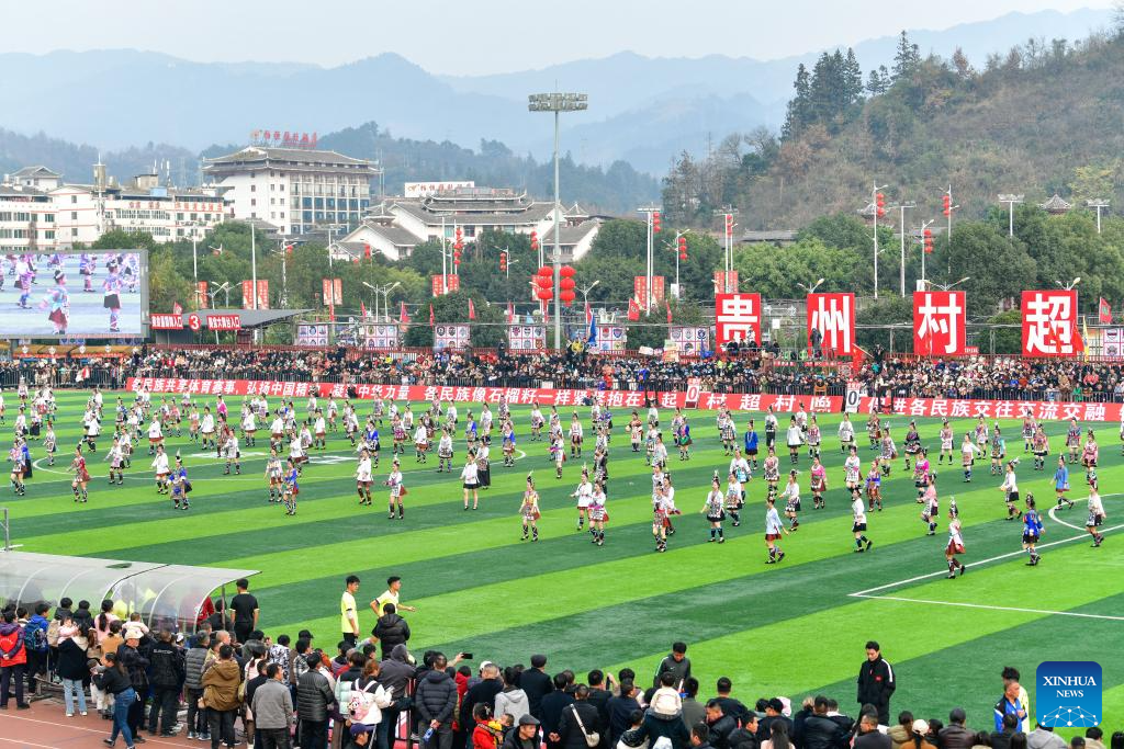 The dancers perform at the halftime during the opening game at the Village Super League 2025 in Rongjiang County of southwest China's Guizhou Province, Jan. 4, 2025. The Village Super League, an amateur football tournament dubbed "Cun Chao" by Chinese netizens, started its third season on Saturday. More than 3,000 players of 108 teams participate in the games this year. (Xinhua/Yang Wenbin)