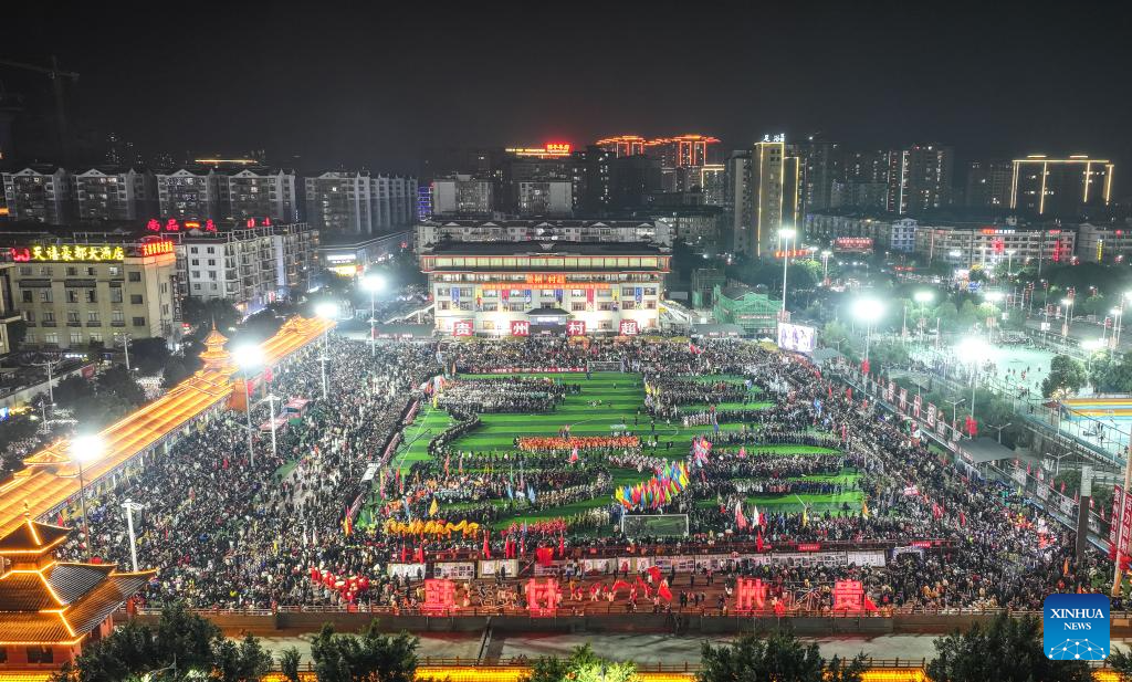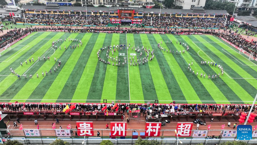 An aerial drone photo taken on Jan. 4, 2025 shows the dancers performing at halftime during the opening game at the Village Super League 2025 in Rongjiang County of southwest China's Guizhou Province. The Village Super League, an amateur football tournament dubbed "Cun Chao" by Chinese netizens, started its third season on Saturday. More than 3,000 players of 108 teams participate in the games this year. (Xinhua/Yang Wenbin)