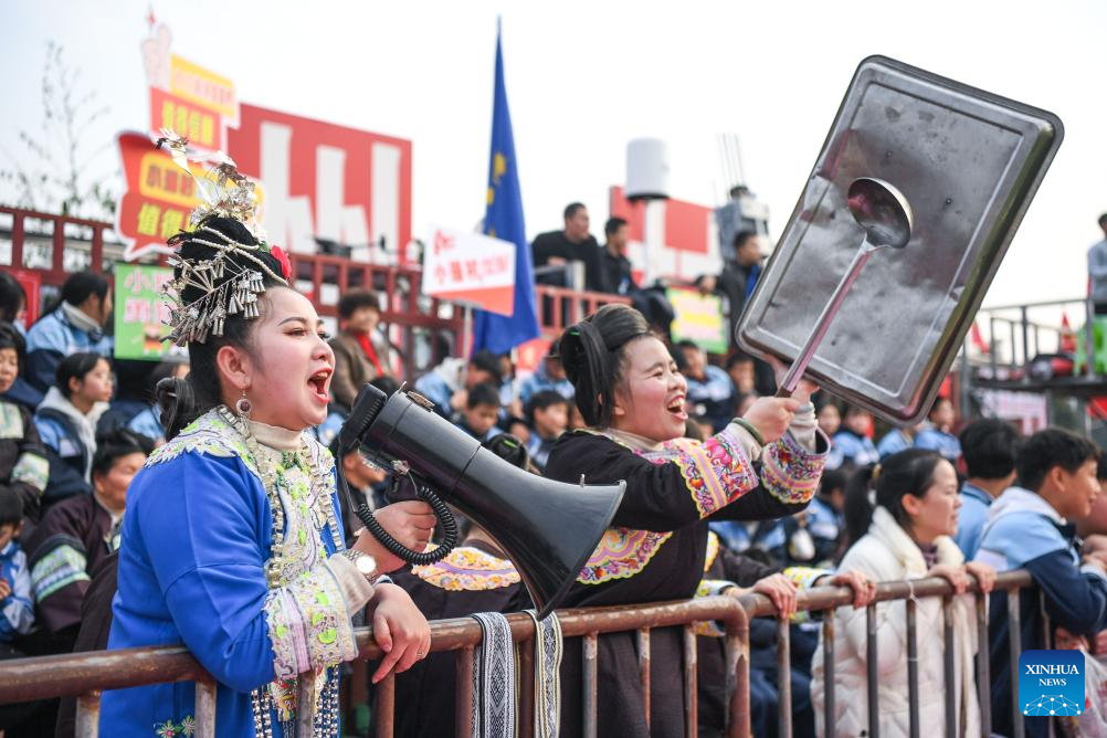 People cheer for the teams at the Village Super League 2025 in Rongjiang County of southwest China's Guizhou Province, Jan. 4, 2025. The Village Super League, an amateur football tournament dubbed "Cun Chao" by Chinese netizens, started its third season on Saturday. More than 3,000 players of 108 teams participate in the games this year. (Xinhua/Yang Wenbin)