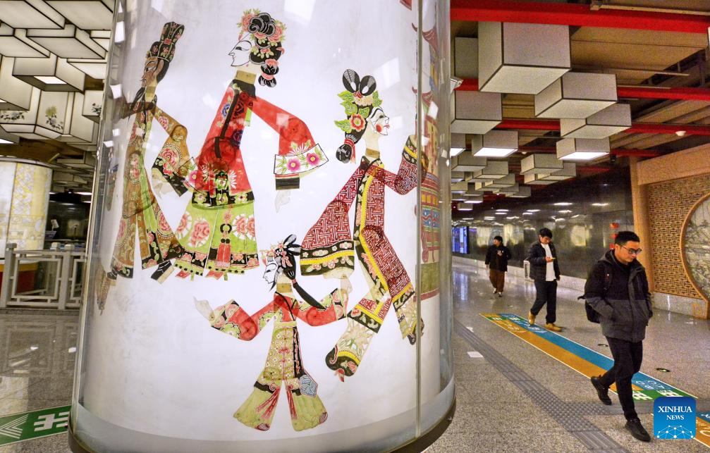 This photo taken on Jan. 4, 2025 shows a cylindrical lightbox decorated with shadow puppet patterns at Ping'anli Station of Beijing Subway Line 19 in Beijing, capital of China. (Xinhua/Li Xin)