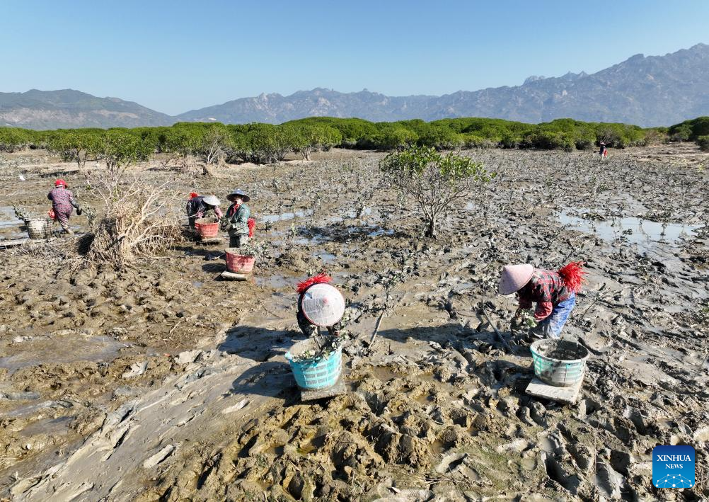 A drone photo taken on Jan. 4, 2025 shows villagers planting mangroves at the Zhangjiangkou National Mangrove Nature Reserve in Yunxiao County, southeast China's Fujian Province. Located in the estuary of the Zhangjiang river, the Zhangjiangkou National Mangrove Nature Reserve covers an area of 2,360 hectares. It was listed as one of the Wetlands of International Importance under the Ramsar Convention on Wetlands in 2008. (Xinhua/Lin Shanchuan)