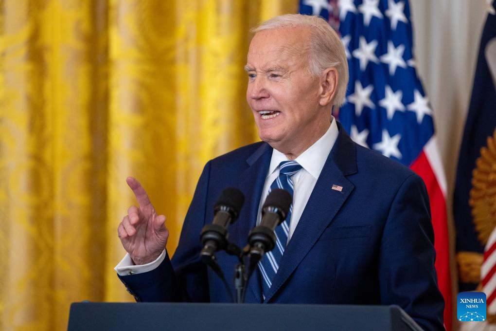 U.S. President Joe Biden speaks at the White House in Washington, D.C., the United States, on Jan. 5, 2025. Japan's Nippon Steel and United States Steel have jointly filed a lawsuit against the U.S. government over President Joe Biden's decision to block the buyout of the American steelmaker by the Japanese company, local media reported Monday. (Xinhua/Hu Yousong)