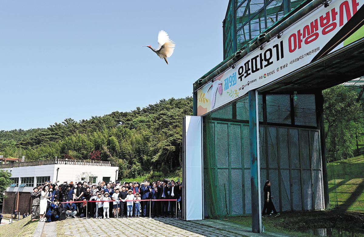 A crested ibis is released into the wild at the Upo Crested Ibis Restoration Center in Changnyeong, South Korea, on May 10. Changnyeong has taken more protective measures in its rural areas where these birds live. (Photo/Xinhua)