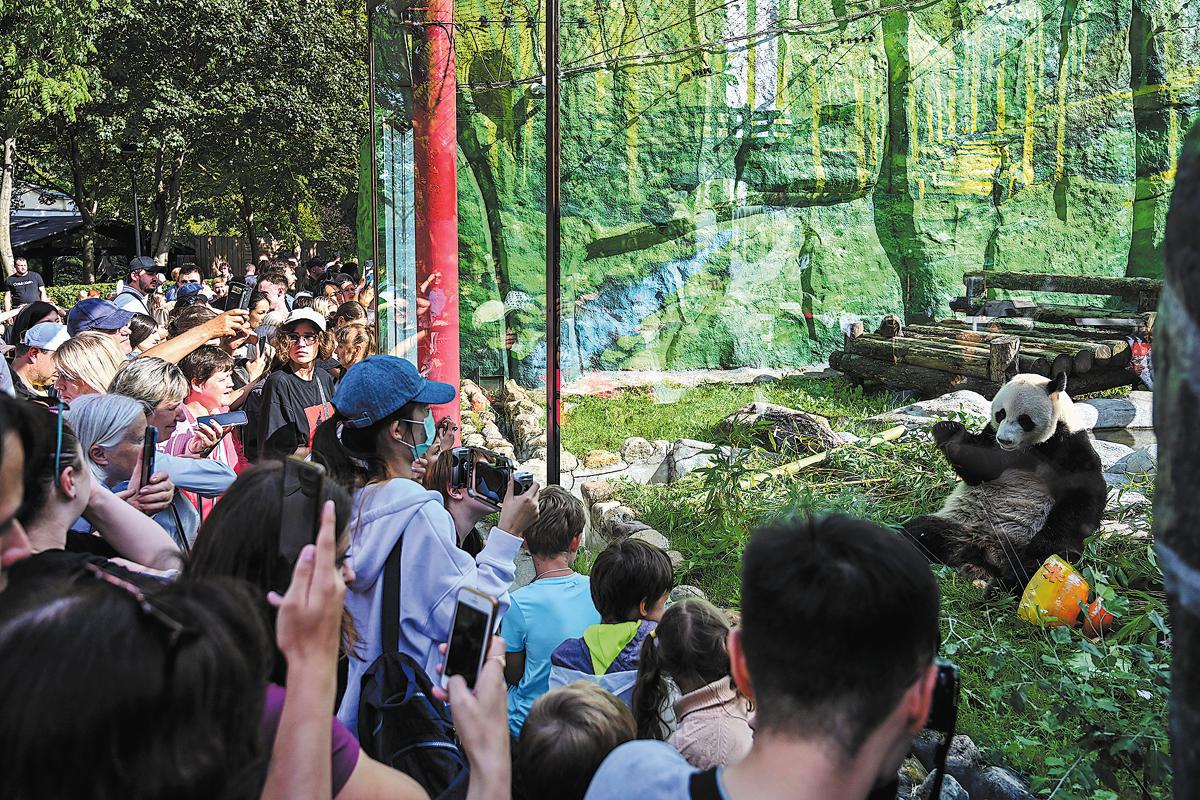 Tourists take photos of giant panda Ru Yi at the Moscow Zoo in Moscow on July 31. (Cao Yang/Xinhua)