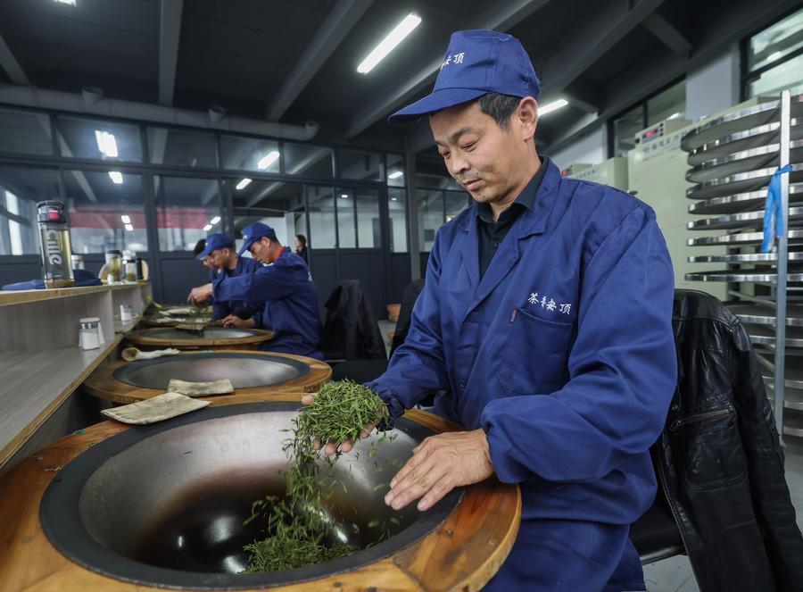 Workers process tea leaves at a workshop of Anding Village in Lishan Township in Hangzhou, east China's Zhejiang Province, April 8, 2024. (Xinhua/Xu Yu)