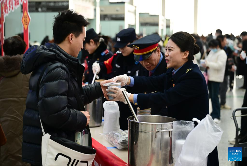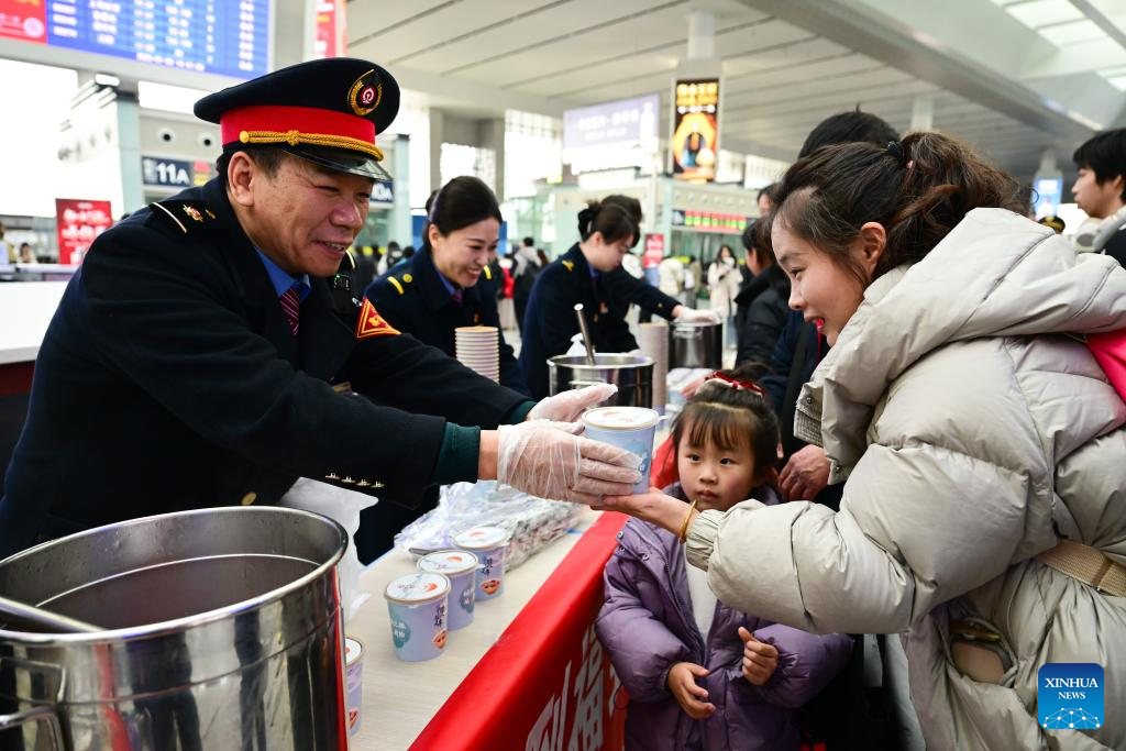 Staff members serve Laba porridge for passengers at Hefei South Railway Station in Hefei, east China's Anhui Province, Jan. 6, 2025. Various activities were held across the country to welcome the upcoming Laba Festival that falls on Jan. 7 this year. (Xinhua/Zhou Mu)