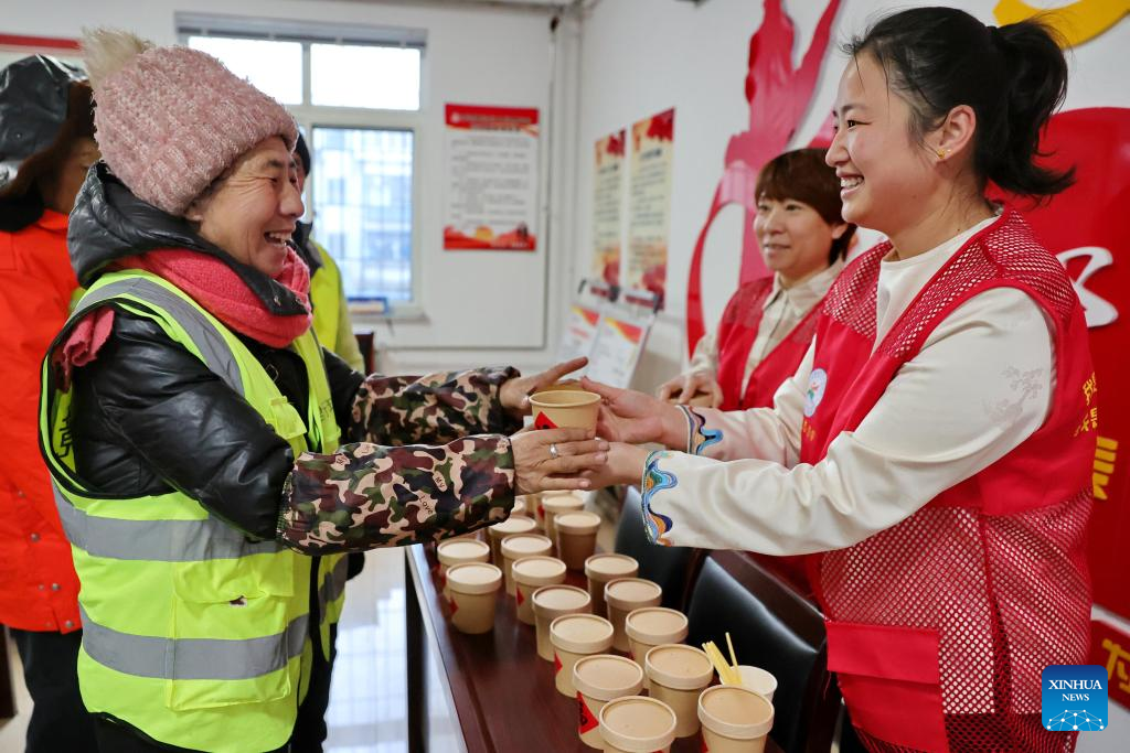 Volunteers serve free Laba porridge for sanitation workers in Haigang District of Qinhuangdao, north China's Hebei Province, Jan. 6, 2025. Various activities were held across the country to welcome the upcoming Laba Festival that falls on Jan. 7 this year. (Photo by Cao Jianxiong/Xinhua)