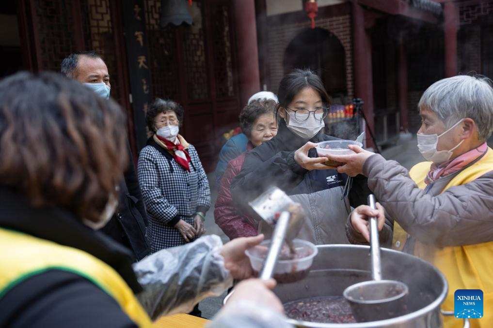 Residents receive Laba porridge in Wuxing District of Huzhou, east China's Zhejiang Province, Jan. 6, 2025. Various activities were held across the country to welcome the upcoming Laba Festival that falls on Jan. 7 this year. (Photo by Yi Fan/Xinhua)