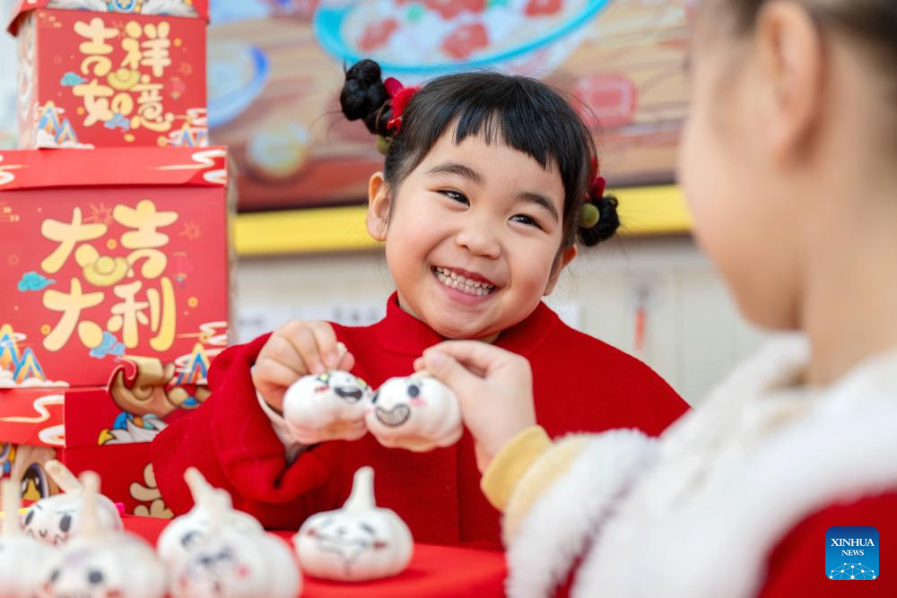 Children paint garlic-themed toys at a kindergarten in Changxing County, Huzhou of east China's Zhejiang Province, Jan. 6, 2025. Various activities were held across the country to welcome the upcoming Laba Festival that falls on Jan. 7 this year. (Photo by Tan Yunfeng/Xinhua)