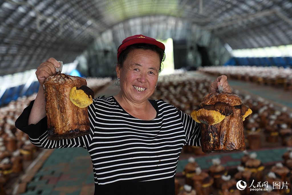 A villager named Lyu Wenfang smiles proudly as she displays the Sanghuangporus sanghuang she has carefully grown in Bajiazi township, Helong city, northeast China's Jilin Province, July 29, 2024. (People's Daily Online/Li Yang)