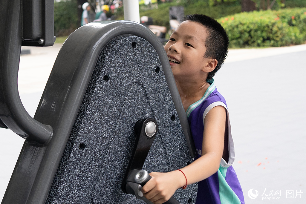 A boy joyfully tries out fitness equipment at an outdoor smart gym in Guangming district, Shenzhen, south China's Guangdong Province, Aug. 7, 2024. (People's Daily Online/Jiang Jialing)